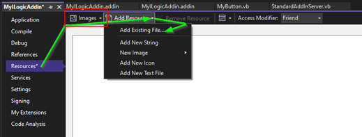 Select “Add Recourse” and “Add Existing File”. Browse and select your images. (if you don’t see the images then make sure you have the image filter selected.)