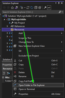 We now have a folder that seems empty in our “Solution explorer”. To be totally honest you don’t need it. You can add files to your recourse from anywhere on your file system. But I think it’s good practice to keep your project files in your project.
