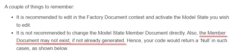 Often I see people using "ThisApplication.ActiveDocument" to get the active document. This also will get you the “Model state member” document. (There is also another drawback to using "ThisApplication.ActiveDocument". See this post "Run Before Save Rule Only Once in Assemblies") And is therefore also affected by the following problem. According to this blog post (by an Autodesk employee), it’s not recommended to edit the “Model state member” document directly. Even worse in some cases the “Model state member” document may not exist and return Nothing/null. Which will break your code!