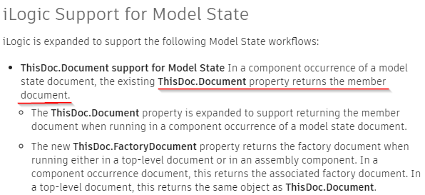 The property “ThisDoc.Document” is one of the most used lines of code in any iLogic rule. But this property returns the “Model state member” document!