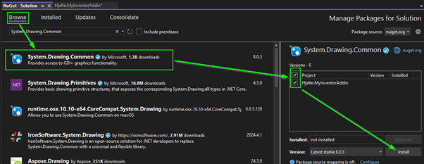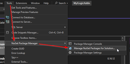 For almost all addins you need the package "System.Drawing.Common". (The only situation I can think of that you don't need it, is when you don't use any icons or forms in your addin...) Therefore select "Tools", "NuGet package manager" and "Manage NuGet packages for solution..."