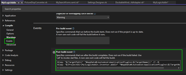 There is an alternative for setting the “Compile events”. You can also set the “Output path”. That has the advantage that all files are copied automatically. (Instead of adding a line in the compile events for each file you want to copy.) The disadvantage is that Visual Studio will always create an extra folder named "net8.0-windows". In the GUI there is no setting to disable that behaviour. But you can disable that behaviour by editing the project file directly.