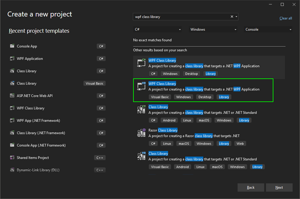 Your second choice is what kind of technologies you want to use in your forms. You have the following options: Winforms, WPF or none. Winform is the oldest technology but you will find a lot of information about it. (If you create/use custom controls in Winforms then you might run into trouble when you need your application to be 64bits. This is for example the case if you also start working with the vault API) With WPF forms you can do more (it’s more flexible) but they are more complicated to create. If you don’t want to create any forms then you can create a “Class Library”. Which is the most simple to set up. In this tutorial, I create a class library with WPF technology.